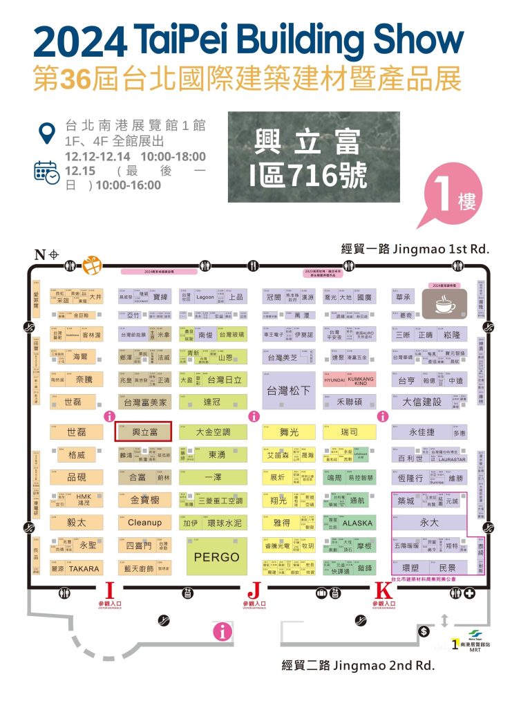 【第36屆台北國際建築建材暨產品展】 台北國際建築建材暨產品展盛大展開!更多西班牙賽麗石、帝通石 大板與最新資訊等您了解,興立富誠摯邀請您蒞臨參觀! 時間: 2024/12/12(四)~12/15(日) 10:00AM~18:00PM (展期最後一天至16:00PM) 地點: 台北南港展覽館1館 (台北市南港區經貿二路1號) 展出攤位: 一樓I區716號